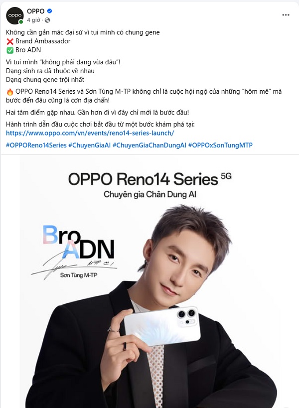Theo xác nhận từ OPPO, đại sứ thương hiệu OPPO Sơn Tùng M-TP không chỉ là gương mặt đại diện mà còn là biểu tượng đồng điệu với tinh thần của Reno14 Series. Dòng sản phẩm này nổi bật bởi sự trẻ trung, cá tính và tiên phong, mang đến hơi thở thời trang và nghệ thuật dành cho thế hệ người dùng trẻ yêu thích sự khác biệt.