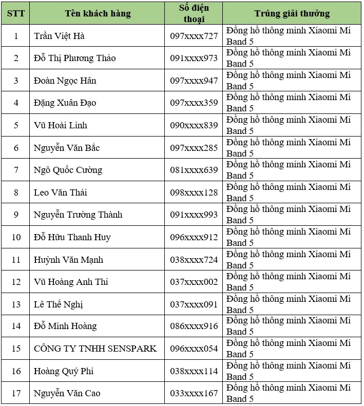- Ngày 26/05/2021 (Quay thưởng cho các khách hàng mua hàng và được cấp mã dự thưởng từ ngày 17/05/2021 đến ngày 24/05/2021). Số lượng 5 giải