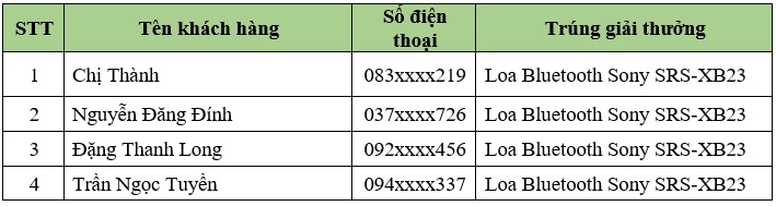 – 04 giải mua Phụ kiện trúng Loa Bluetooth Sony SRS-XB23 mỗi tuần. Thời gian dự kiến quay thưởng: Quay làm 04 đợt.