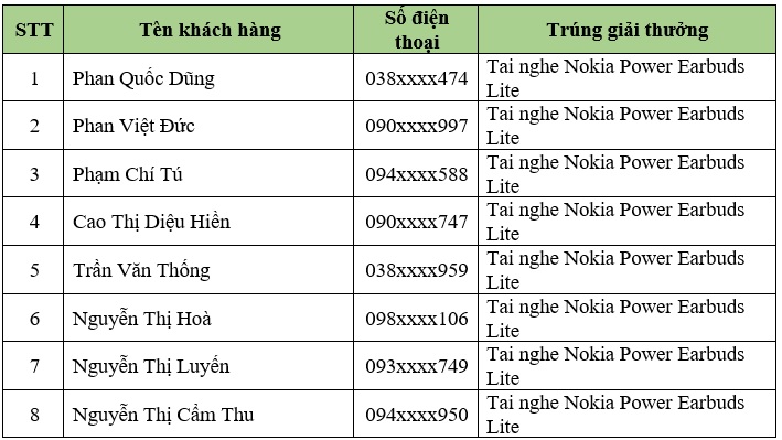 – 08 giải mua Nokia trúng Tai nghe Nokia Power Earbuds Lite mỗi tuần. Thời gian dự kiến quay thưởng: Quay làm 04 đợt.