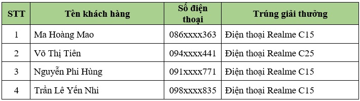 – Mua Realme trúng điện thoại Smartphone: 01 giải thưởng trúng 01 Realme C25 trị giá 4.690.000 đồng ( quay vào tuần 2) hoặc Realme C15 trị giá 3.790.000 đồng ( Quay các tuần 1,3,4)