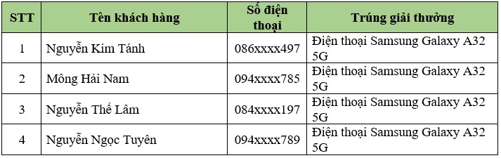 – 04 giải mua Samsung trúng Samsung Galaxy A32 5G mỗi tuần. Thời gian dự kiến quay thưởng: Quay làm 04 đợt.