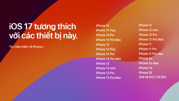 Danh sách các thiết bị được hỗ trợ cập nhật hệ điều hành iOS 17 mới bao gồm: