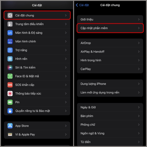 Bước 1: Trên điện thoại iPhone, bạn mở vào Cài đặt > chọn Cài đặt chung > chọn Cập nhật phần mềm.