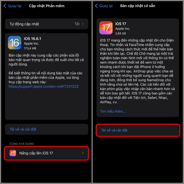 Bước 2: Nhấn chọn Nâng cấp lên iOS 17 > chọn Tải về và cài đặt iOS 17 bản chính thức cho iPhone của mình nhé.