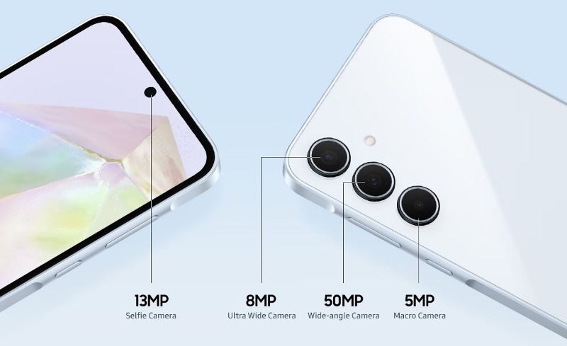 Galaxy A35 5G tiếp tục ghi điểm với khả năng quay chụp được nâng cấp đáng kể so với thế hệ tiền nhiệm. Cụm camera sau bao gồm camera chính 50MP, đi kèm camera góc rộng 8MP và camera macro 5MP. Đáng chú ý, camera chính được tích hợp chống rung OIS và công nghệ hiển thị HDR với 68 triệu màu sắc. Nhờ đó thiết bị có thể chụp linh hoạt góc rộng hay cận cảnh đều vô cùng xuất sắc.