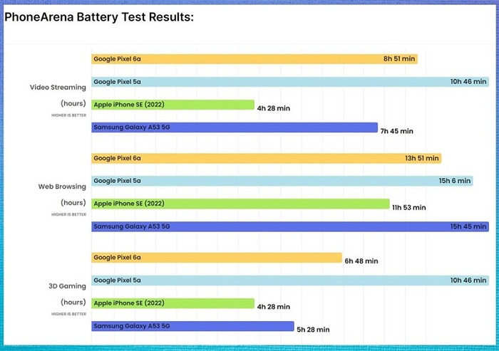 Trang PhoneArena đã thực hiện bài test pin của Google Pixel 6a, kết quả cho thấy với mức dung lượng pin 4.410 mAh, máy có thể hoạt động liên tục trong 8 tiếng 51 phút để xem video, 13 tiếng 51 phút để lướt web và 6 tiếng 48 phút để chơi các tựa game 3D. Kết quả này tốt hơn so với những gì chúng ta mong đợi về một viên pin khiêm tốn như vậy. Đồng thời, với kết quả trên thì mình tin Google Pixel 6a sẽ vẫn có thể đáp ứng tốt nhu cầu sử dụng của bạn trong cả ngày dài với các tác vụ cơ bản và các tựa game giải trí nhẹ.