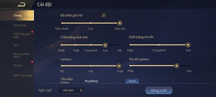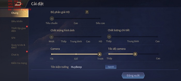 Đầu tiên mình thử cài đặt cấu hình cao nhất như hình dưới để chơi Liên Quân Mobile. Kết quả là máy khá giật và lag.