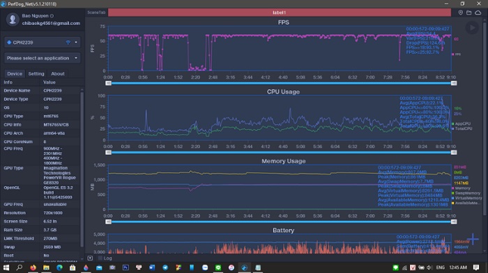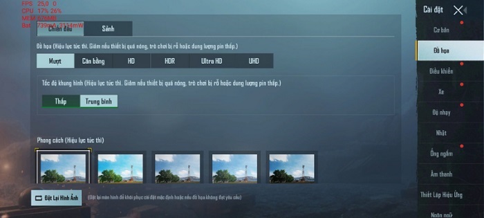 Để đánh giá hiệu năng OPPO A54 khách quan hơn chúng tôi đã tùy chỉnh lại cấu hình trong game xuống mức thấp hơn. Và kết quả khả quan hơn rất nhiều, máy chơi ổn định hơn dù chi tiết game không được tốt, FPS đã đạt mức 60, các thao tác như vuốt skill, động tác điều khiển, tốc độ di chuyển camera,… mượt và trơn tru hơn.