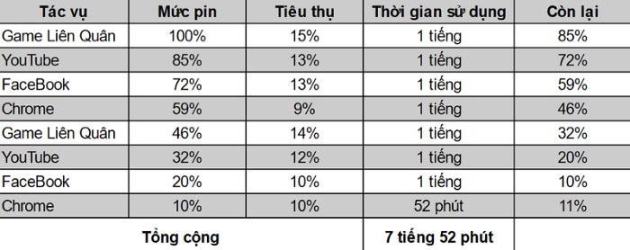 Vẫn là bài test pin tiêu chuẩn với 4 tác vụ: Lướt Facebook, dùng Chrome duyệt web, xem Youtube và chơi Liên Quân. Mỗi tác vụ trong 1 tiếng và xoay vòng. Bên cạnh đó là các điều kiện khác như: