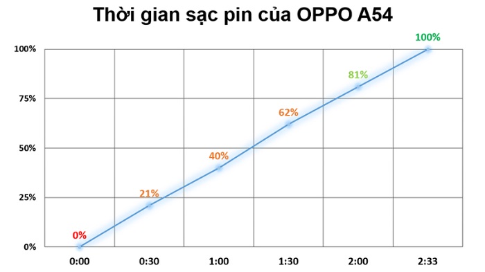 Các bạn sẽ mất hơn 2 tiếng rưỡi để đợi OPPO A54 đầy pin. Kết quả tuy không quá tốt nhưng điều này vẫn chấp nhận được bởi vì chỉ cần chờ khoảng 30 đến 45 phút đã có đủ năng lượng sử dụng nửa ngày.