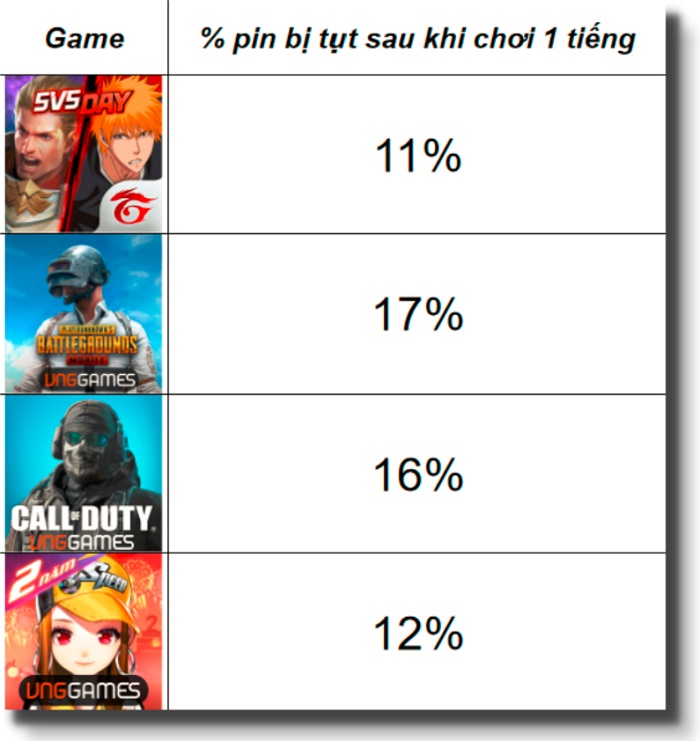 Như vậy khi chơi Liên Quân Mobile 1 tiếng máy tụt 11% pin, PUBG Mobile tụt 17% pin, Zing Speed Mobile tụt 12% và Call of Duty Mobile tụt 16%.