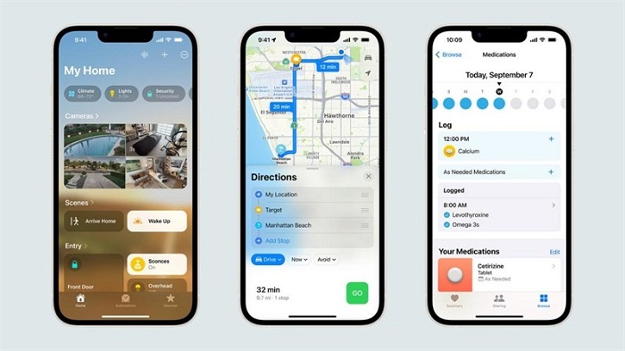 - Ứng dụng Sức khỏe: Được bổ sung thêm khả năng theo dõi thuốc và nhắc uống thuốc, tích hợp với đồng hồ thông minh Apple Watch.
