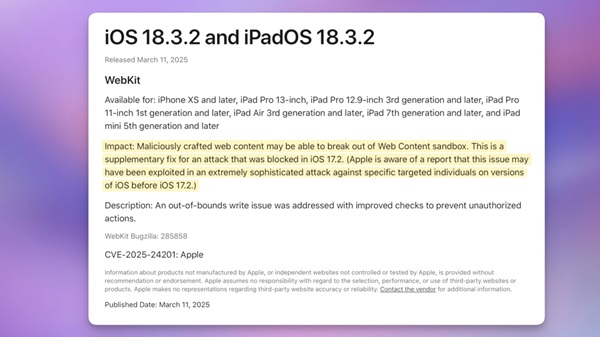 Các phiên bản iOS trước đây đã xuất hiện lỗ hổng này, tuy nhiên đến phiên bản iOS 18.3.2 đã được xử lý. Bên cạnh đó, người dùng cũng có thể theo dõi chi tiết về vấn đề bảo mật được khắc phục thông qua CVE số do Apple cung cấp.