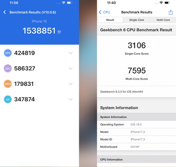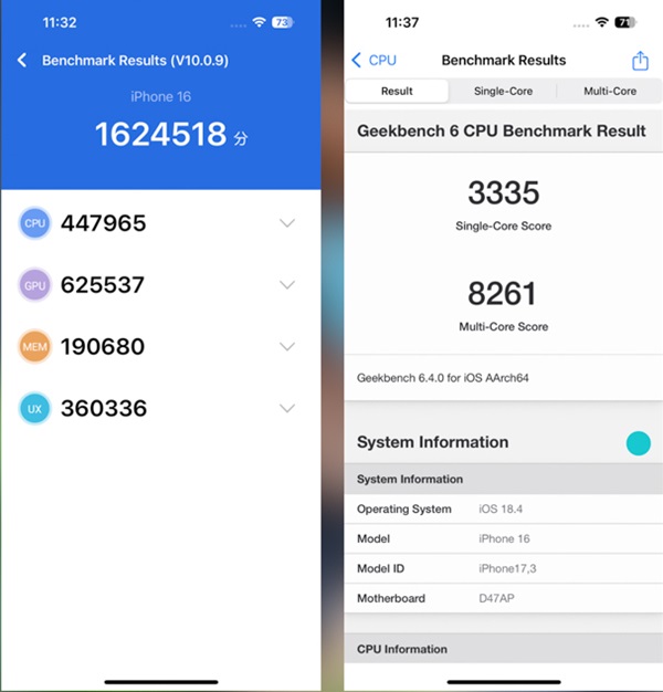 Cụ thể, điểm Antutu trên iPhone 16 sử dụng iOS 18.4 là 1,624,518 điểm và Geekbench 6 là 3,335 điểm đơn nhân / 8,261 điểm đa nhân. Con số này lớn hơn hẳn so với điểm số Antutu 1,538,851 điểm và Geekbench 6 3,106 điểm đơn nhân / 7,595 điểm đa nhân trên iPhone 16 sử dụng iOS 18.3.