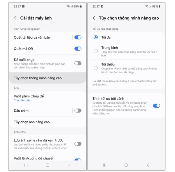 Ứng dụng Máy ảnh và Bộ sưu tập trên phiên abnr One UI 6.0 đã có một số thay đổi về giao diện giúp người dùng deexx dàng chụp, chỉnh sửa hình ảnh hơn. Với ứng dụng Máy ảnh, chúng ta có thể dễ dàng lựa chọn tách biệt độ phân giải và tỷ lệ khung hình thay vì các tùy chọn cố định ở phiên bản tiền nhiệm. Ngoài ra, tính năng “Trình tối ưu bối cảnh” trong phần cài đặt Máy ảnh đã được chuyển vào mục “Tùy chọn thông minh nâng cao”.