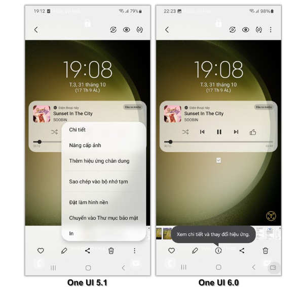 Một thay đổi nhỏ nữa trong Bộ sưu tập trên One UI 6.0 chính là phần chi tiết ảnh. Trên phiên bản One UI mới, bạn chỉ cần bấm vào biểu tượng chữ “i” để xem chi tiết và thay đổi hiệu ứng cho hình ảnh rất dễ dàng.