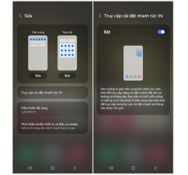 Ngoài ra, giao diện sửa thanh thông báo cũng được làm mới khi mình có thể tùy chỉnh các chức năng ở phía trên hoặc toàn bộ thanh thông báo. Đặc biệt, với tính năng “Truy cập cài đặt nhanh tức thì”, mình có thể vuốt xuống từ góc trên bên phải màn hình để truy cập bảng cài đặt nhanh mà không phải xem thông báo.
