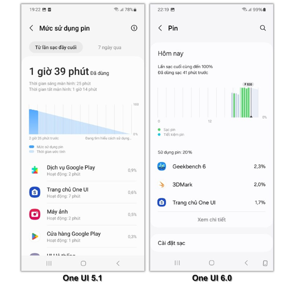 Phần Cài đặt của One UI 6.0 có biểu tượng với màu sắc đậm hơn, điều này giúp giao diện dễ nhìn. Ngoài ra, mình còn thấy sự xuất hiện của mục “Pin” ngay dưới mục “Màn hình”. Ở mục này có sự thay đổi lớn với phần “Mức sử dụng pin”, giờ đây One UI 6.0 hiển thị thời lượng hoạt động của pin rất trực quan và giúp chúng ta dễ dàng quản lý thời lượng sử dụng.