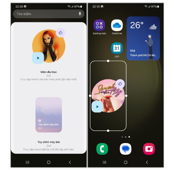 One UI 6.0, một số widget mới được bổ sung trông hiện đại và trực quan hơn so với One UI 5.1. Là một người thường xuyên nghe nhạc nên widget Mâm đĩa than mới của YouTube Music trên One UI 6.0 khiến mình rất thích thú, chúng ta còn có thể tương tác với widget này như chọn dừng/phát nhạc hay “like” bài hát. Chưa dừng ở đó, One UI 6.0 còn bổ sung thêm một widget thú vị khác như “Tùy chỉnh máy ảnh”, giúp kích hoạt nhanh một chức năng cụ thể của Máy ảnh một cách nhanh chóng.