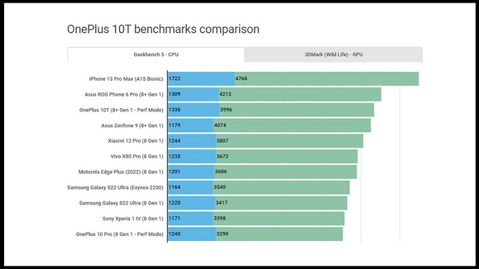 Reviewer của chuyên trang Android Authority đã trải nghiệm các tựa game cần cấu hình cao điển hình như Genshin Impact trên OnePlus 10T. Kết quả cho thấy điện thoại đã thể hiện rất tốt khi số FPS luôn dao động ở mức gần 60 FPS dù đang ở mức cài đặt đồ họa cao nhất. Đồng thời nhiệt độ cũng không bao giờ vượt quá ngưỡng 39 độ C.