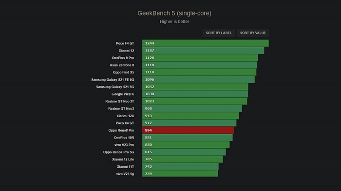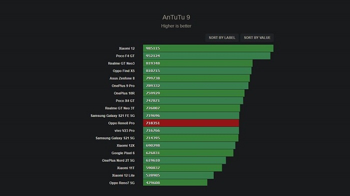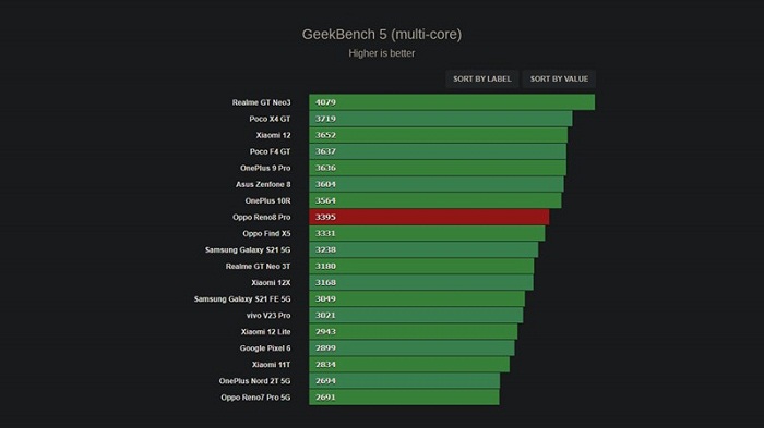 Để có thể chứng minh được sức mạnh của Dimensity 8100-MAX trên OPPO Reno8 Pro, reviewer của GSMArena đã thực hiện một số bài kiểm tra benchmark và tính ổn định bằng phần mềm GeekBench 5, Antutu. Kết quả cho thấy Reno8 Pro đã thể hiện sự ưu việt hơn đôi chút so với các đối thủ khác cùng dùng trên một nền tảng chip.