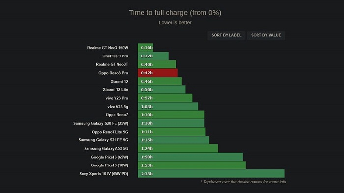 Chưa hết, OPPO Reno8 Pro còn được hỗ trợ công nghệ sạc nhanh SuperVOOC với công suất lên tới 80W, giúp người dùng có thể sạc đầy nhanh chóng. Trải nghiệm reviewer từ trang GSMArena cho thấy, máy chỉ mất khoảng 30 phút để sạc từ 0% lên đến 90% và mất khoảng 42 phút là sạc đầy pin cho thiết bị.