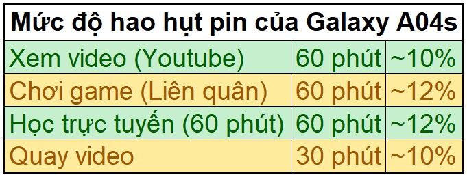 Galaxy A04s là một sản phẩm có thời lượng pin khá ấn tượng, khi với hầu hết các tác vụ sử dụng hàng ngày, trong một giờ đồng hồ máy chỉ tiêu hao khoảng 10%-15%, tùy từng tác vụ mà bạn sử dụng.