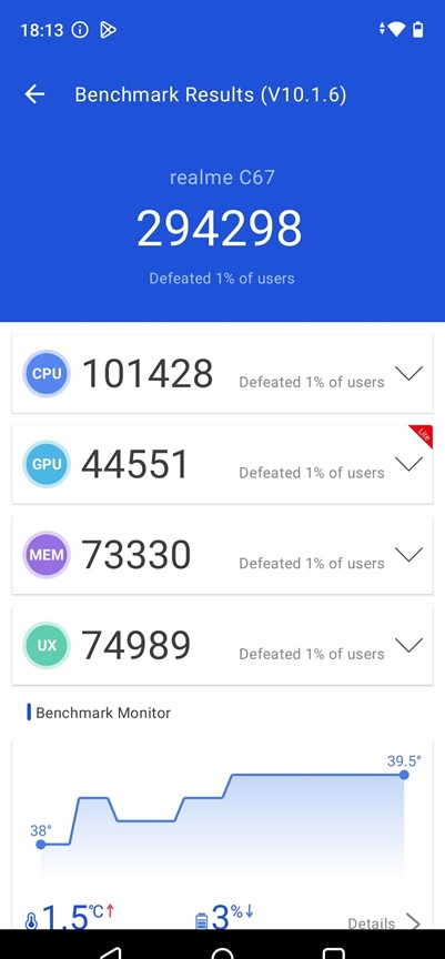 Với kết quả kiểm tra cao trên Geekbench 6 và AnTuTu Benchmark 10, smartphone giá rẻ realme C67 cho thấy hiệu suất ổn định trong các tác vụ hàng ngày và chơi game. Tuy nhiên, máy không tránh khỏi tình trạng nóng lên khi chơi game liên tục trong thời gian dài.