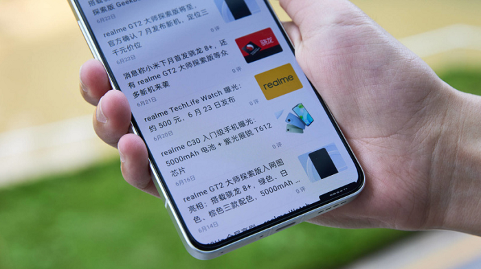 Mặt trước của Realme GT2 Master Explorer Edition có phần viền màn hình siêu mỏng cùng tỷ lệ màn hình tổng thể rất cao. Phần viền màn hình này có thể sánh ngang với viền mỏng trên các sản phẩm flagship Samsung. Ngoài ra, camera selfie cũng được thiết kế khá nhỏ gọn và hầu như không ảnh hưởng gì đến quá trình trải nghiệm màn hình của người dùng.