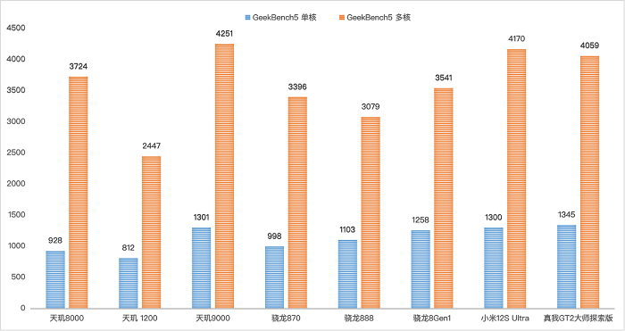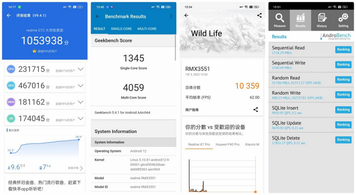 Kết quả chấm điểm hiệu năng của Realme GT Master Explorer Edition trên phầm mềm Antutu không thua kém bất kỳ chiếc điện thoại Gamingphone nào trong thời điểm hiện tại. Với điểm số hơn 105.000 điểm, có thể nói máy có thể cân hết mọi tựa game mobile phổ biến hiện nay một cách mượt mà. Ở phần mềm Geekbench 5, chip Snapdragon 8+ Gen 1 vẫn nằm trong top đầu những con chip mạnh nhất với 1345 điểm đơn nhân và 4059 đa nhân.