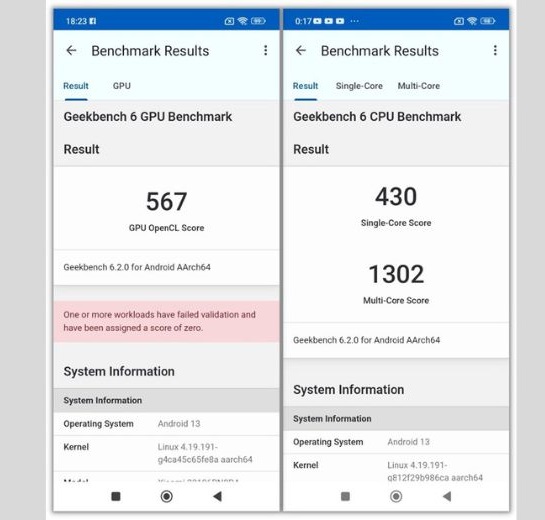 Qua bài test CPU trên phần mềm GeekBench cho thấy Helio G85 không phải là một con chip mạnh mẽ nên hiệu năng của máy chỉ ở dừng mức xử lý tốt các tác vụ cơ bản thường ngày. Dù vậy, điểm đơn nhân 430 điểm và đa nhân 1302 điểm của máy đều cao hơn so với Redmi 12C với điểm đơn nhân 404 điểm và đa nhân 1207 điểm. Tuy nhiên, nếu so sánh với các con chip nhà Qualcomm thì hiệu năng của Redmi 13C vẫn thấp hơn một chút.