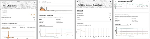 - Với phần mềm 3DMark Wild Life Extreme: Galaxy Z Fold5 đạt điểm tổng là 3.726 điểm và điểm FPS trung bình là 22.30 điểm.