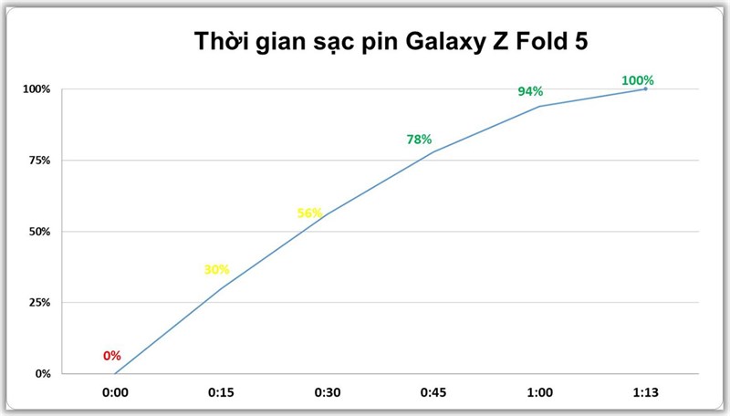 Ngoài ra, chúng tôi cũng thực hiện bài test đo thời gian để sạc đầy pin Galaxy Z Fold5 với củ sạc Ugreen 65W và dây sạc nhanh của Ugreen. Kết quả cho thấy để sạc đầy pin từ 0% lên 100% mất khoảng 1 tiếng 13 phút. Nghĩa là bạn chỉ cần sạc 15 phút là đã có 30% pin để sử dụng trong trường hợp gấp gáp.