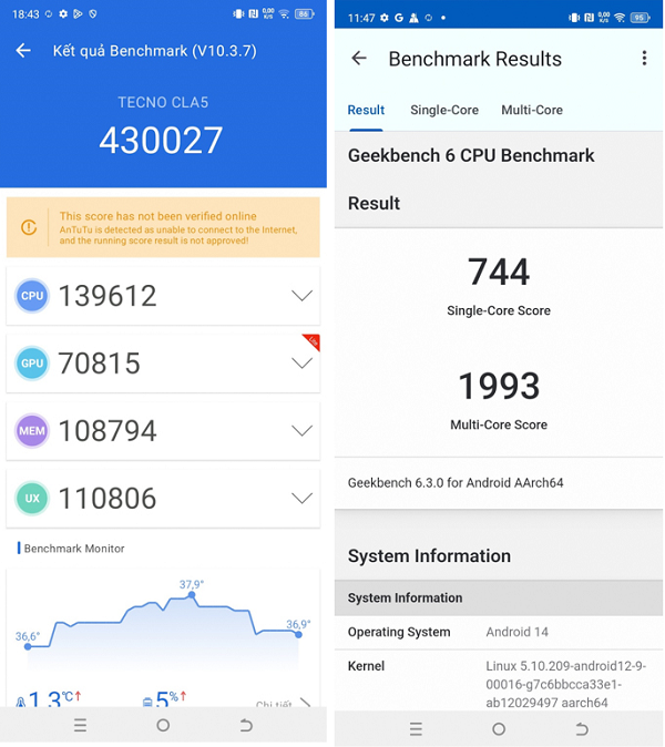 Kết quả bài test hiệu năng của TECNO CAMON 30S qua ứng dụng Antutu Benchmark và Geekbench 6 đạt điểm số khá tốt. Cu thể: