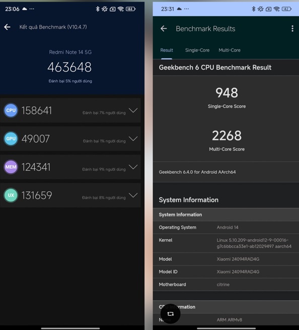 Kết quả chấm điểm AnTuTu cho thấy Redmi Note 14 5G đạt 463,648 điểm, Geekbench 6 đạt 948 điểm đơn nhân, 2,268 điểm đa nhân. Điểm số này không quá nổi bật, sẽ phù hợp với các sản phẩm dưới 6 triệu hơn là các sản phẩm hơn 7 triệu.