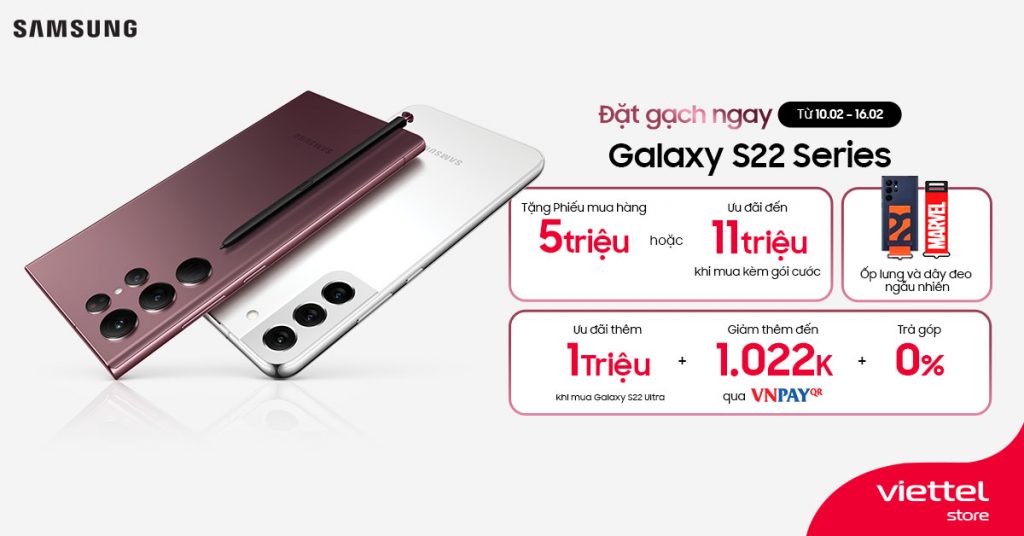 Ngay sau khi ra mắt, Viettel Store chính thức mở chương trình đặt gạch các siêu phẩm thuộc dòng Galaxy S22 với rất nhiều siêu ưu đãi như phiếu mua hàng 5 triệu đồng hoặc giảm đến 11 triệu đồng khi mua kèm gói cước, giảm thêm 1 triệu đồng khi mua Galaxy S22 Ultra và còn nhiều hơn thế nữa!!!