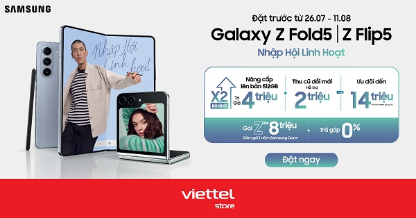 Hôm qua (26/07), Samsung chính thức ra mắt Galaxy Z Fold5 & Z Flip5. Đặc biệt, ngay từ hôm nay Viettel Store mở chương trình đặt hàng trước cho bộ đôi smartphone màn hình gập hot nhất với nhiều ưu đãi hấp dẫn lên đến 14.000.000 đồng, cùng nhiều đặc quyền dành cho chủ sở hữu trong ngày mở bán.