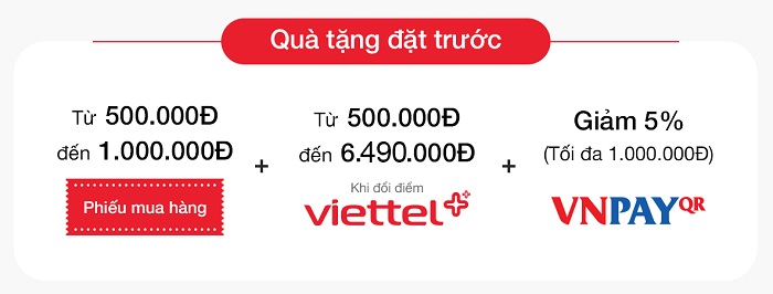 - Phạm vi áp dụng: Áp dụng khi mua đặt trước qua website TẠI ĐÂY, tổng đài miễn phí 1800 8123 và tất cả các khách hàng mua hàng tại hệ thống siêu thị Viettel Store trên toàn quốc.