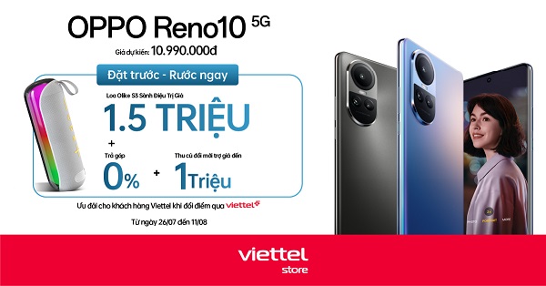 Reno10 là sự lựa chọn hoàn hảo được nâng cấp qua 10 thế hệ. Bạn có mong muốn được sớm sở hữu trên tay sản phẩm “10 điểm” này của OPPO? Ngay từ bây giờ hãy nhanh tay đặt trước Reno10 tại Viettel Store để nhận được quà tặng trị giá 1.500.000đ đi kèm ưu đãi hấp dẫn nhé!