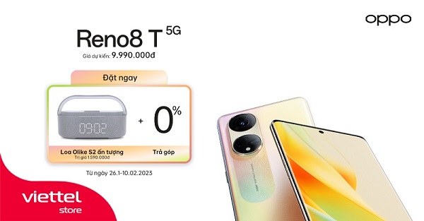 Từ ngày 26/1 – 10/2/2023, Viettel Store mở đặt trước OPPO Reno8 T 5G (128GB) với giá bán hấp dẫn cùng quà tặng Loa Bluetooth Olike S2 trị giá 1.590.000đ và trả góp 0%. Xem chi tiết ngay chương trình trong bài viết dưới đây!