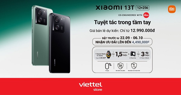 Xiaomi 13T là phiên bản tiếp theo thuộc Xiaomi 13 Series vừa được ra mắt với giá bán dự kiến chỉ 12.990.000đ. Đặc biệt, trong giai đoạn từ 22/09 – 06/10, khách hàng tham gia chương trình đặt trước Xiaomi 13T (12+256) – Tuyệt tác trong tầm tay tại Viettel Store sẽ được nhận ưu đãi lên tới 4.490.000đ.