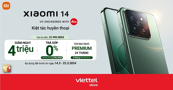 Từ ngày 14/03 đến 22/03/2024, Viettel Store mở đặt trước trước Xiaomi 14 (12/256GB) – Kiệt tác huyền thoại với ưu đãi cực sốc: Giảm đến 4.000.000 đồng, trả góp 0%, bảo hành 24 tháng,… Là fan của Xiaomi thì không nên bỏ lỡ nhé bạn ơi!!!