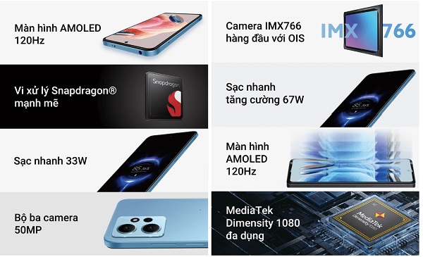 Redmi Note 12 và Note 12 Pro có chung ngôn ngữ thiết kế: mặt lưng và khung viền phẳng, camera gọn gàng tinh tế, màn hình đục lỗ thời thượng,… Hai máy được tích hợp nhiều tính năng cao cấp như: màn hình Super AMOLED 120Hz độ sáng cao, vi xử lý mạnh mẽ Snapdragon 685 trên Note 12 và Dimensity 1080 trên Note 12 Pro, pin 5.000 mAh hỗ trợ sạc nhanh, camera 50MP,…