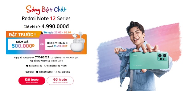 Đặc biệt, khi đặt trước Xiaomi Redmi Note 12 series tại Viettel Store từ ngày 25/3 đến 6/4/2023, khách hàng sẽ nhận được nhiều phần quà giá trị: Tai nghe Xiaomi Buds 3 trị giá 2.690.000 đồng hoặc giảm 500.000đ trừ thẳng vào giá.