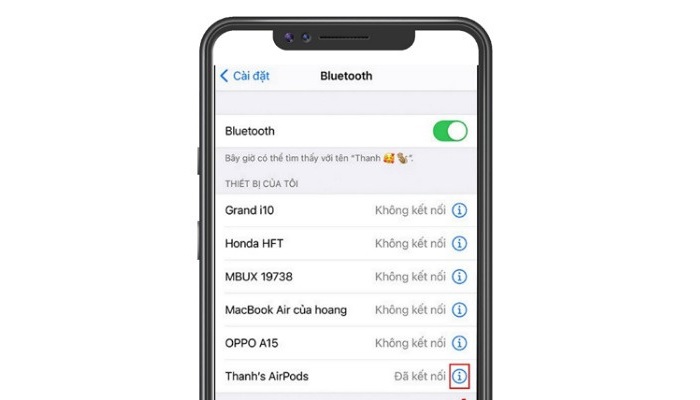 Bước 2: Nhấn biểu tượng (i) cạnh tên Airpods >> chọn Forget This Device (Quên thiết bị này).