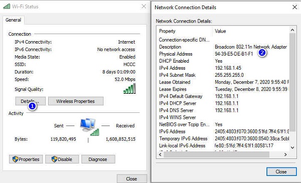 Bước 4: Thông tin về địa chỉ MAC máy người dùng sẽ được nằm trong phần Properties.