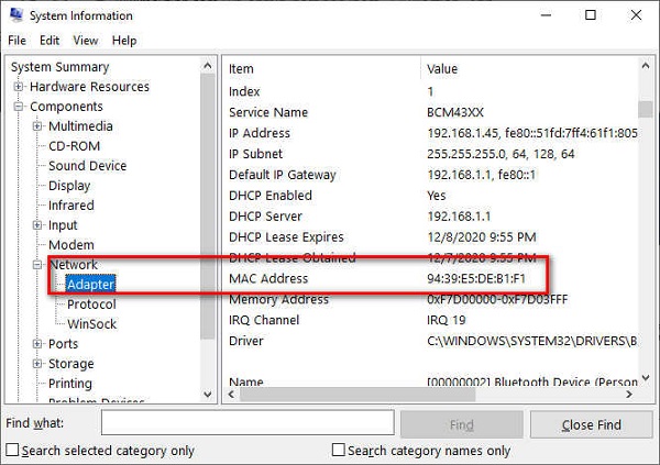 Bước 2: Chọn mục Components >> Network >> Adapter.