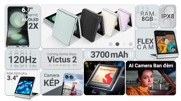 Galaxy Z Flip 5 là siêu phẩm điện thoại màn hình gập thế hệ mới đến từ thương hiệu Samsung. Thiết bị này sở hữu màn hình ngoài Flex Window với kích thước 3.4 inch, cùng trọng lượng tổng thể là 187 gram. Máy có màn hình chính Dynamic AMOLED 2X 6.7inch, hỗ trợ tần số quét 120Hz. Nhờ tích hợp con chip Snapdragon 8 Gen 2, đi kèm với 8GB RAM và ROM lên tới 512GB, nên chiếc Galaxy Flip 5 có khả năng đa nhiệm vượt trội