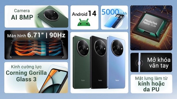 Xiaomi Redmi A3 được thể hiện nổi bật với camera AI 8MP, cung cấp khả năng chụp ảnh rõ nét và chi tiết, ngay cả trong môi trường ánh sáng yếu. Camera này khá lý tưởng cho việc ghi lại được những khoảnh khắc hàng ngày hay là chụp ảnh phong cảnh tuyệt đẹp. Máy sở hữu màn hình kích thước 6.71 inch HD+ mang đến những trải nghiệm hình ảnh vô cùng sắc nét và sống động.